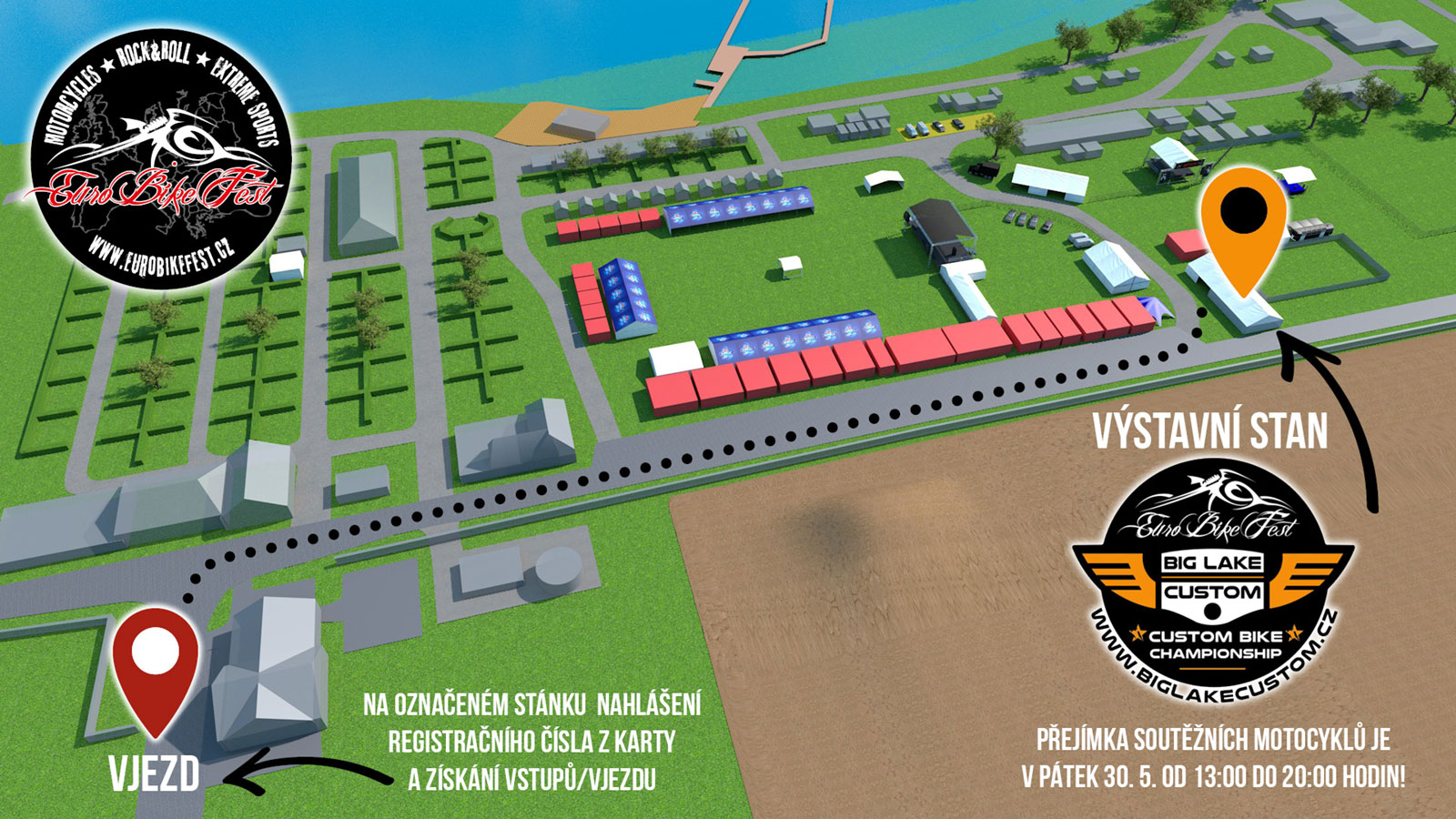 Každý ON-LINE registrovaný soutěžící, který přijede k hlavní bráně do autokempu Merkur, nahlásí ostraze své přidělené startovní číslo, na základě kterého dostane 2x volný vstup a průjezd pro auto. Následně pokračuje areálem po hlavní asfaltové cestě až k velkému stanu Big Lake Custom show (nalevo od „main street“ 30 m za objektem pizzerie LAGUNA).